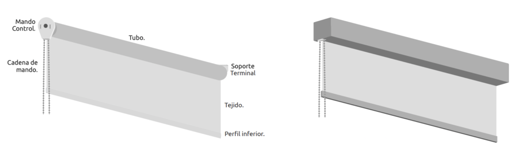Es un producto de apariencia minimalista en el que el tejido es el protagonista. El tejido que puede ser decorativo, técnico o blackout, se enrolla en un tubo de aluminio el cual gira de manera manual (por medio de una cadena) o automatico (con motor).