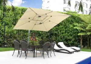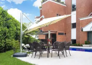 Sombrilla Menorca La diferencia principal entre la Sombrilla Palma y la Menorca es el color del marco; la Menorca se caracteriza por su acabado tipo acero inoxidable lo cual le da una elegancia única. 3m x 3m Estrcutura color acero inoxidable Nuestra Galería