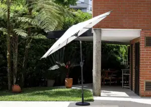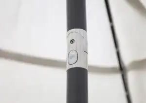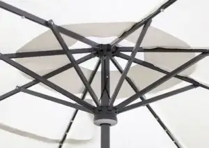 Sombrilla de poste central, de con forma redonda de 2.70m de diámetro, apertura con manivela, botón que permite inclinar la cabeza de la sombrilla y sistema de iluminación con panel solar para uso nocturno.