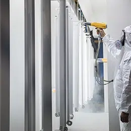 La perfilería y las partes en aluminio son pintadas bajo estrictos controles de calidad y mediante tecnología de última generación. El aluminio se desengrasa y se le aplica una capa anticorrosiva antes del proceso de lacado.